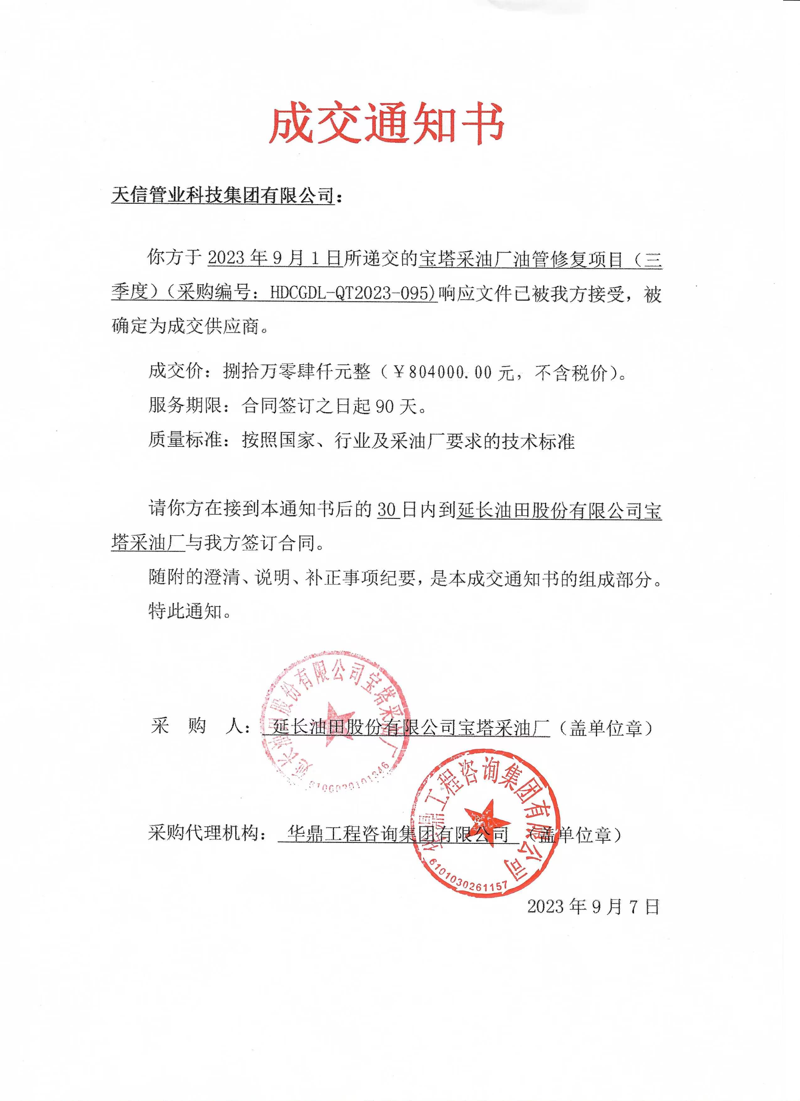 你方于2023年9月1日所遞交的寶塔采油廠油管修復(fù)項目(三季度)(采購編號:HDCGDL-QT2023-095)響應(yīng)文件已被我方接受,被確定為成交供應(yīng)商。